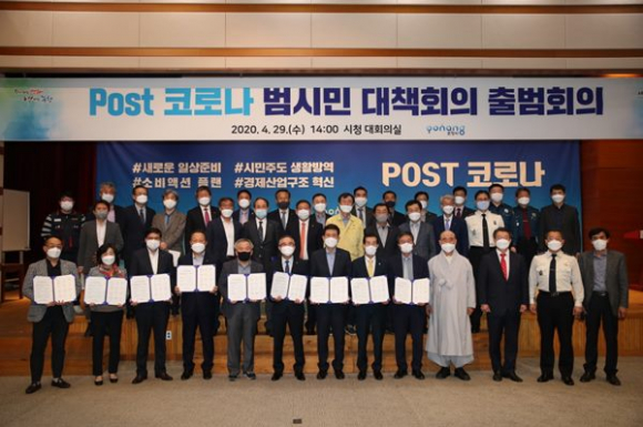 포항시는 4월 29일 각계각층의 시민 대표 40명이 참석한 가운데 ‘포스트(post) 코로나 범시민대책회의’의 출범회의를 열고, 공동 협력을 위한 업무협약 체결과 함께 사회적 거리두기 지속, 생활방역으로의 전환, 지역경제 회복 등 ‘코로나19’ 극복을 위한 방안에 대한 논의를 가졌다.
