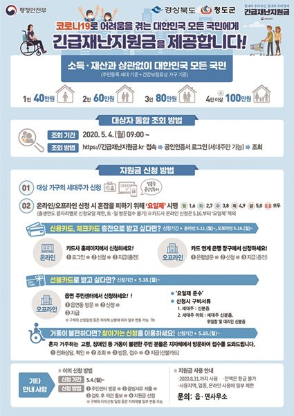 청도군(군수 이승율)은 지난 5월 4일 생계급여, 기초연금, 장애인연금 수급가구 6,806가구에 대해 31억 2천여만원의 “정부형 긴급재난지원금”을 별도의 신청이나 방문없이 계좌에 일괄 지급하였다.