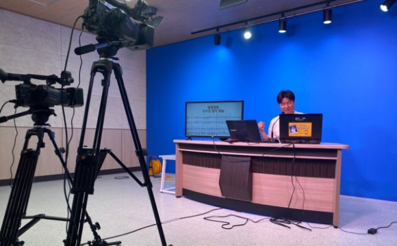 | ↑↑ 두산노래교실 이종수 강사가 수성영상미디어센터에서 유튜브 생방송을 시험방송으로 진행하고 있다. |