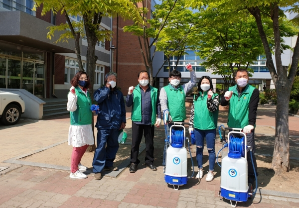 대구 북구 읍내동 새마을협의회(회장 장승우)와 새마을부녀회(회장 김영숙)는 4월 27일, 4월 29일, 양일간 관내 개학 준비 중인 학교에 방역자원 봉사활동을 실시했다.