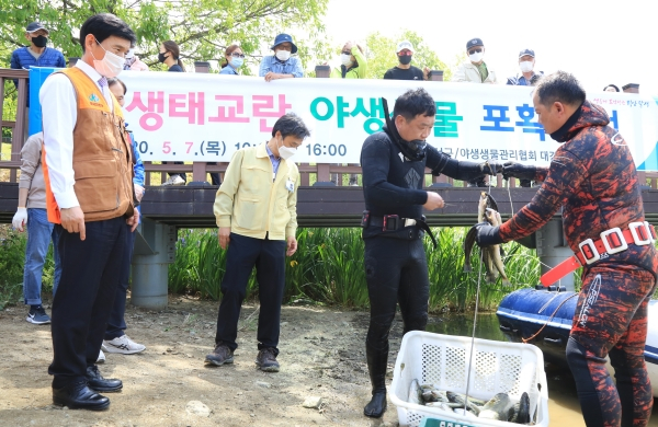 대구 달서구(구청장 이태훈)는 지난 5월 7일 월광수변공원 내 도원지에서 야생생물관리협회 대구·경북지부와 합동으로 생태교란 어종인 배스, 블루길 포획행사를 가졌다.