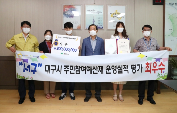 대구 서구청(구청장 류한국)은 대구광역시 주관‘2019년 주민참여예산제 운영 평가’에서 대구 8개 구·군 중 최우수 기관으로 선정 되어 특별교부금 2억 원을 확보했다.