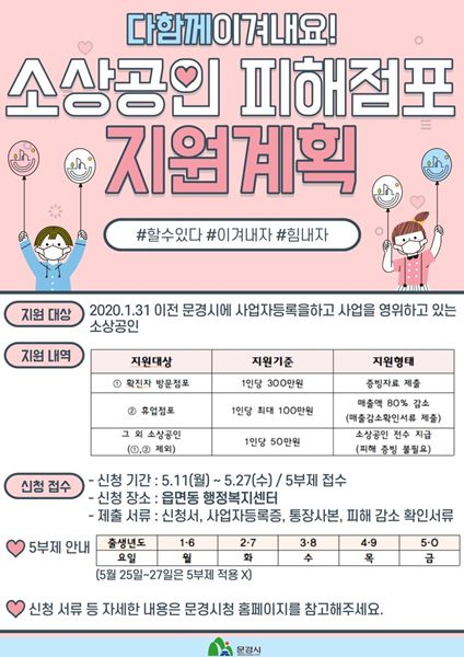 문경시는 코로나19로 경영이 어려운 소상공인 피해점포를 지원하기 위해 지난 5월 11일부터 오는 5월 27일까지 사업장 소재지 읍면동행정복지센터에서 신청 접수를 받는다.