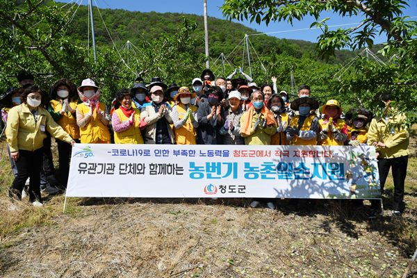 이승율 청도군수는 “현재까지 알선창구를 통해 접수 된 100여호 농가를 대상으로 500여명의 일손돕기 참여자가 복숭아 적과, 대추 순치기, 마늘쫑 뽑기 등 다양한 농작업을 지원했고, 특히 군청 공직자들과 공공기관을 중심으로 대대적인 농촌일손돕기 지원에 나설 계획이다” 라고 밝혔다.