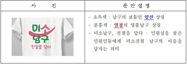 남구는 민원실 직원들이 미소친절 티셔츠를 맞춰 입고 민원인을 맞이하는 ‘미소친절 T(티셔츠)-day’를 오는 9월까지 매월 둘째 주 수요일마다 실시한다고 밝혔다.