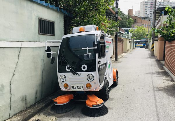 | ↑↑ 골목을 청소하고 있는 친환경 전기 소형 노면청소차 모습 |