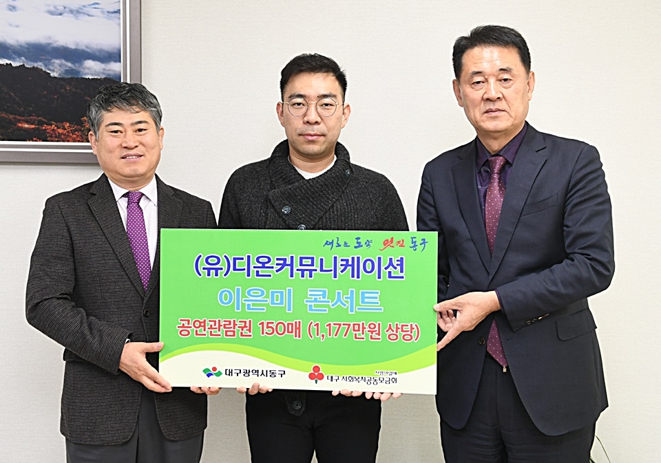 (유)디온커뮤니케이션(대표 진수일)은 21일 동구 지역내 저소득층의 문화생활 지원을 위해 1,177만원 상당의 공연관람권 150매를 대구 동구청(구청장 배기철)에 기탁했다. 동구청은 이은미 콘서트 'WINTER&FALL'의 공연관람권을 각 행정복지센터를 통해 저소득주민들에게 전달할 예정이다.