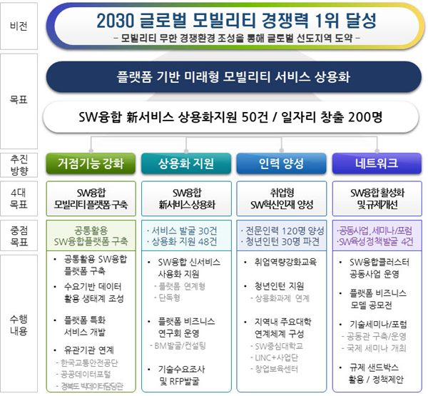 SW융합클러스터 2.0사업은 경북도내 7개시군(경주, 포항, 구미, 경산, 영천, 칠곡, 김천)이 참여해 지난 3월 과기정통부 산하 정보통신산업진흥원 공모사업에 선정돼 국․도비 포함 총 132억 4800만원으로 올해부터 2024년까지 5년간 SW융합 모빌리티 플랫폼 구축 및 운영, SW융합 서비스 발굴 및 기술개발 지원, SW융합 청년 인턴쉽 고용, 전문 인력양성 등을 지원한다.