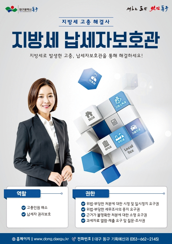 ‘납세자보호관’ 제도와 ‘찾아가는 납세자보호관 서비스’에 관한 자세한 사항은 동구청 기획예산과 납세자보호관에게 전화(☎053-662-2415) 또는 방문해 문의하면 된다.