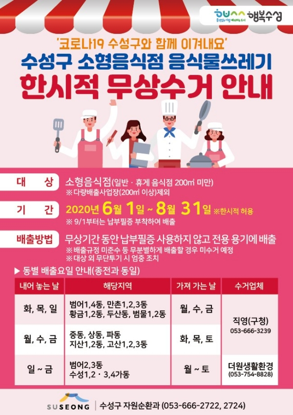 대구 수성구(구청장 김대권)는 오는 6월 1일부터 8월 31일까지 3개월 간 매출감소로 어려움을 겪고 있는 소형 음식점의 음식물쓰레기를 무상으로 수거한다고 25일 밝혔다.