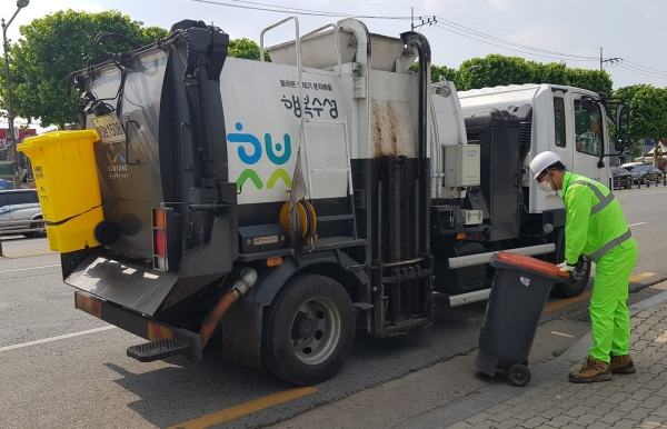 | ↑↑ 수성구청 환경미화원이 수거 차량에 음식물쓰레기를 옮기고 있다. |