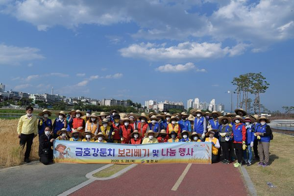 영천시(시장 최기문)는 5월 28일 최근 코로나19로 심신이 지친 시민들을 달래주고 있는 금호강 둔치 꽃밭에 식재된 보리를 시민들과 함께 수확했다.