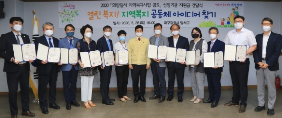 대구 달서구(구청장 이태훈)는 5월 28일 구청 4층 회의실에서 2020 ‘희망달서 지역복지사업 공모’에 선정된 11개 기관의 대표들이 참석한 가운데 지원금 전달식을 개최했다.
