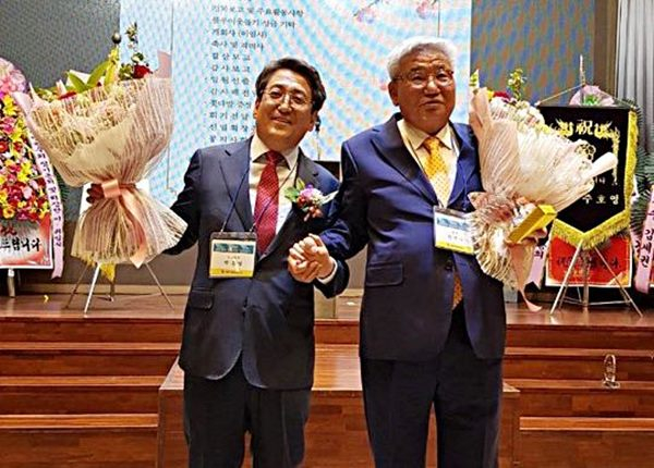 | ↑↑ (왼쪽)박홍열 신임회장과 한선수 이임회장이 함께 손을 맞잡고 서로를 겪려하는 모습 |