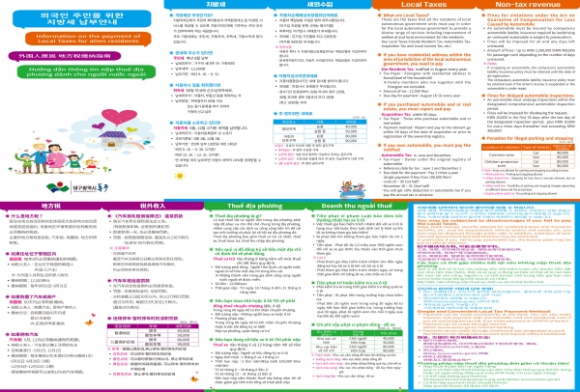 대구시 동구청은 6월 1일 국제화·다문화 시대로 매년 증가하고 있는 외국인의 납세편의 제공과 각종 세금체납 예방을 위해 영어, 중국어, 베트남어 3개 외국어로 번역한 지방세 및 세외수입 납세 안내 리플릿을 동구 건강가정·다문화가족지원센터, 대구출입국·외국인사무소, 각동 행정복지센터에 배부했다.