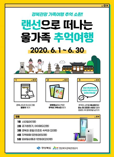 경상북도와 경북문화관광공사는 포스트 코로나 시대의 안전한 비대면 개별관광을 활성화하고자 경북나드리 이벤트 시리즈를 구상해, 첫 번째 이벤트로 「랜선으로 떠나는 울 가족 추억여행」을 6월 1일부터 실시한다.