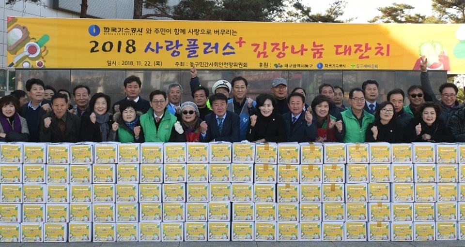 대구 동구청(구청장 매기철)은 22일 동구 아양아트센터 야외마당에서 한국가스공사(사장 직무대리 김영두) 후원으로 사랑플러스 김장나눔행사를 열었다.
