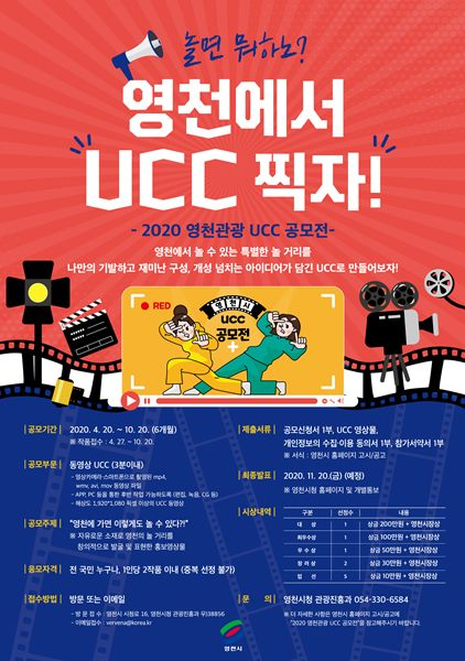 영천시(시장 최기문)는 UCC 공모를 통해 기발하고 산뜻한 영상콘텐츠를 발굴해 영천의 매력적인 관광자원을 소개하고 홍보하고자 10월 20일까지 영천 관광 UCC 공모전을 개최한다.