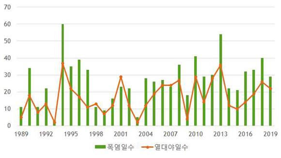 | ↑↑ 최근 30년간 대구시 폭염 및 열대야 일수 추세 |