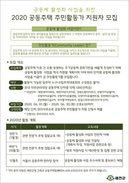 예천군(군수 김학동)이 이달 6월 30일까지 공동주택 입주자 등 봉사활동을 중심으로 공동주택과 그 주변의 공동체 의식 증진‧삶의 질 향상을 위해 공동주택 공동체 활성화 사업 주민활동가 지원자를 모집한다.