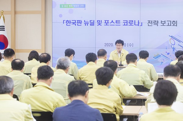 구미시(시장 장세용)에서는 6월 10일 시청 상황실에서 전부서장이 모인 가운데「한국판 뉴딜 및 포스트 코로나」전략 발굴 보고회를 개최했다.