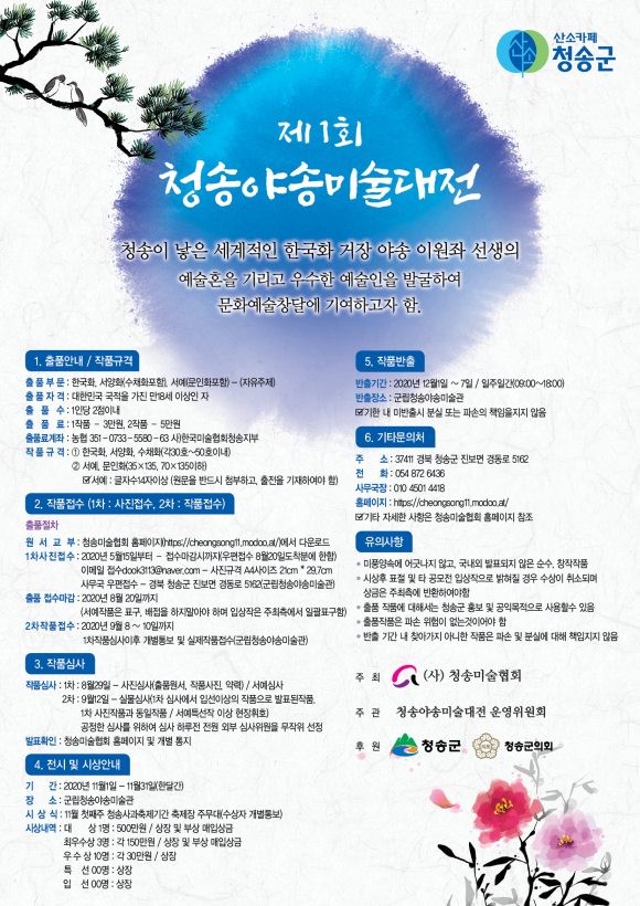 ‘청송야송미술대전’은 2019년 작고한 야송 고(故) 이원좌 화백의 예술혼을 기리고 우수한 지역 문화예술인을 발굴하여 지역 문화예술 발전에 기여하고자 올해 처음 개최하는 미술 작품 공모전이다.