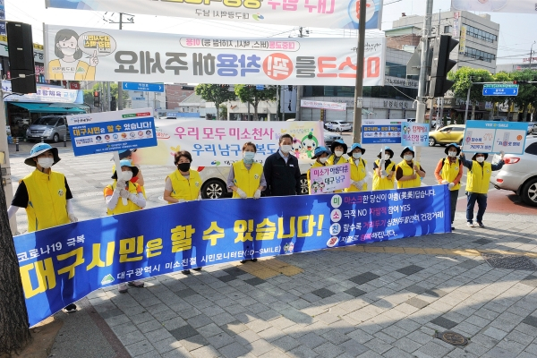 대구광역시 남구청(구청장 조재구)은 미소친절 시민모니터단 남구지회(회장 장재선)에서 지난 9일 코로나19 극복을 위한 생활 속 거리두기 확산 및 미소친절 홍보 캠페인을 펼쳤다고 밝혔다.
