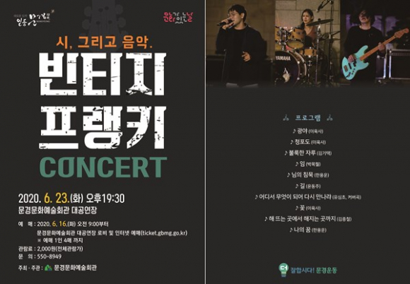 문경문화예술회관에서는 6월 호국보훈의 달을 맞이해 문화가 있는 날 프로그램으로 시의 감성을 음악에 담는‘빈티지 프랭키 콘서트’공연을 오는 6월 23일 19:30, 문경문화예술회관 대공연장에서 개최한다.
