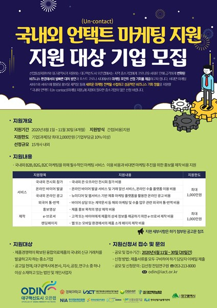 대구시는 코로나19 사태로 급변하고 있는 비즈니스 환경에서의 새로운 마케팅 전략수립과 추진을 지원하기 위해 ‘대구혁신도시 오픈랩’을 통해 ‘국내외 언택트 마케팅 지원’을 공고하고, 6월 30일까지 지원기업을 모집한다.
