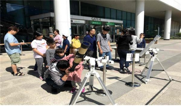 | ↑↑ 국립대구과학관을 찾은 관람객들이 천체망원경으로 태양을 관찰하는 모습 |
