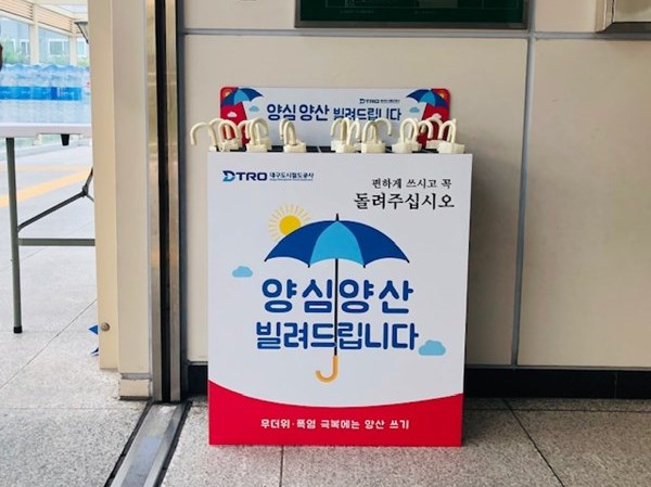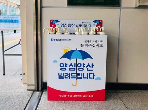 먼저 공사는 지난 6월 17일부터 무더위에 대비해 3호선 3개 역사(매천시장역·청라언덕역·수성구민운동장역) 대합실에 양심양산을 비치해 시민 누구나 대여할 수 있도록 하고 있다.