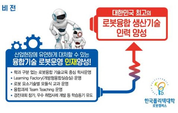 로봇 분야는 기계, 전자, IT, 자동화 등 여러 가지 전공 영역이 융합한 산업으로 전통적인 학과 운영 시스템으로는 성과 창출이 어려운 분야이므로, 로봇캠퍼스는 학과간 장벽을 허물어 기업체 요구에 맞는 융합 중심의 교육을 실시한다.