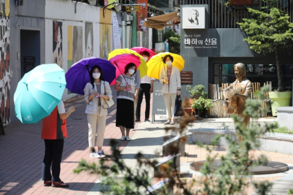 | ↑↑ 코로나19 생활 속 거리두기의 일환으로 투어 참가자들에게 양산을 제공하고 있다. |