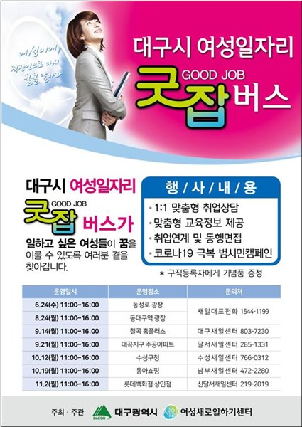 취업을 희망하는 지역 경력단절 및 미취업 여성의 경제 활동 참여 확대를 위해 운영하는 대구시 ‘굿잡(good job)버스’가 6월 24일 동성로 야외무대에서 첫 출발해 11월까지 대구지역 곳곳을 차례로 방문한다.