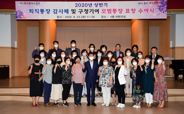 대구 동구(구청장 배기철)는 지난 23일 구청 대회의실에서 ‘2020년 상반기 퇴직통장 감사패 및 구정기여 모범통장 표창 수여식’을 개최했다.