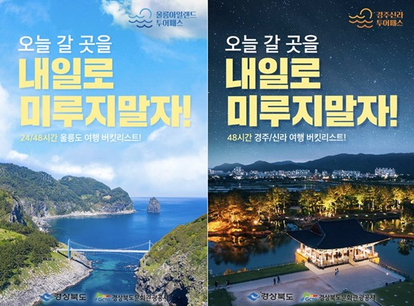 24일에 출시되는 경북투어패스는 2종으로, 경주, 포항, 영천을 대표하는 관광지 18개소로 구성한‘경주-신라투어패스’(광역패스)와 울릉도의 주요 관광지 6개소 이용과 대중교통(버스) 혜택을 담은 ‘울릉아일랜드투어패스’(특화패스)이다. 패스에는 다수의 맛집, 숙박할인까지 포함하고 있어 지역관광업계 활성화도 기대된다.