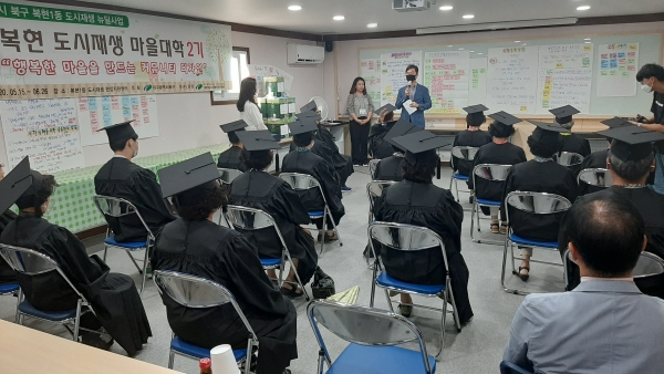정상현 도시재생과장은 “이번 마을대학 과정을 통해 도시재생 사업에 대한 이해를 높이고 주민역량을 강화해 수료생들이 복현1동 도시재생뉴딜사업의 리더 역할을 해 줄 것으로 기대하고 있다”며, “수료생들의 다양한 의견들은 향후 복현1동 도시재생 뉴딜사업에 반영될 수 있도록 적극 지원하겠다.”고 밝혔다.