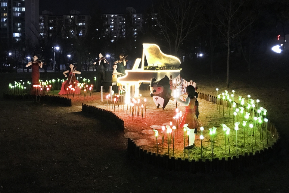 낮에는 어린이 놀이터와 같은 이곳은, 밤에는 낭만적인 분위기가 가득한 불빛공간으로 바뀐다. 피아노 토피어리는 아름다운 불빛으로 빛나고, 은은하게 비춰주는 카라와 코스모스, 튤립 등 LED 꽃들이 포토존을 전체적으로 더욱 아름답게 해준다.