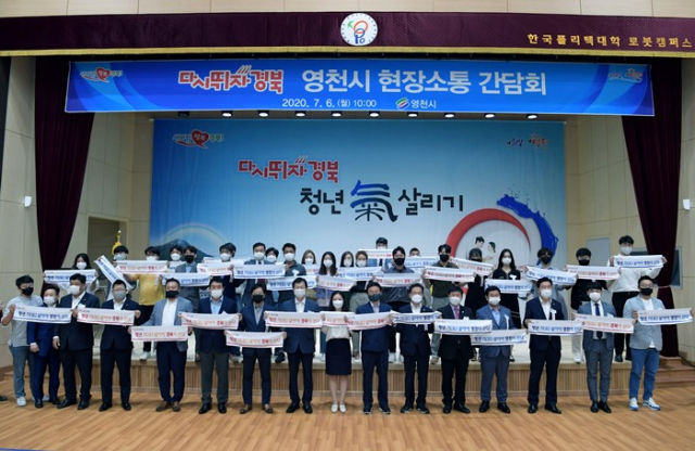 본격적인 간담회에 앞서 지역 청년 35명과 청년 기살리기 퍼포먼스로 ‘청년 기(氣)가 살아야 경북,영천이 산다’는 구호를 외치며 활기차게 시작하였으며 이어 경북도의 ‘다시뛰자 경북’ 추진 전략 발표 및 영천시 코로나19 대응과제 발표를 통해 코로나19에 선제적, 적극적 조치와 긴급 지역경제 활성화 대책 등에 대해 설명했다.