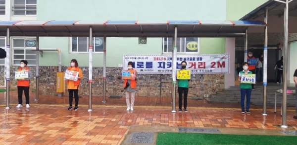 이번 캠페인은 남대구초등학교 교내에서 재학생들과 대명2동 우리마을 교육나눔 추진위원이 함께 코로나19 극복을 위한 생활 속 안전한 거리두기 캠페인을 실시하였다.