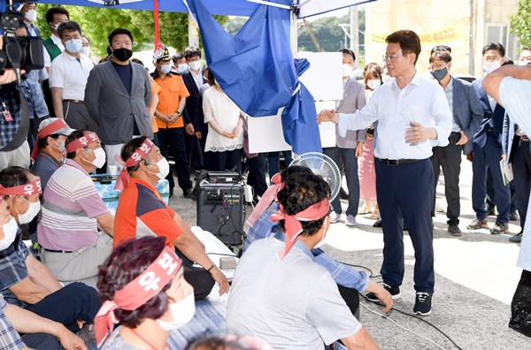 | ↑↑ 군위현장사무실 입구에서 농성중인 추진위와 대화중인 이철우 경북도지사 |