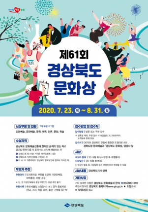 경상북도는 지역문화 창달과 전통 문화예술의 창조적 발전에 기여한 공로자를 선발하기 위해 ‘제61회 경상북도 문화상’ 후보자를 7월 23일부터 8월31까지 공개 모집한다.