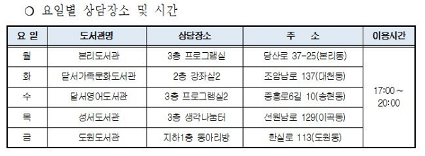 상담이 필요한 아동 및 청소년들은 달서구건강가정‧다문화가족지원센터(☎593-1511) 및 청소년상담복지센터(☎638-1388)로 사전 전화예약을 하면 달서구립도서관(오후5시부터 저녁8시까지)에서 상담을 받을 수 있다.