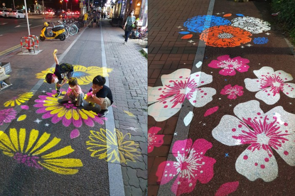 영남대 일대가 힐링의 공간으로 거듭나고 인근 상가들의 가게의 문이 활짝 열리길 바라며, 아름다운 꽃그림과 희망을 주는 메시지로 차가운 콘크리트 바닥을 빛의 열기로 가득 채웠다.