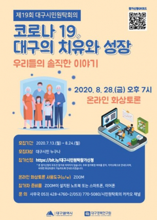 대구시는 코로나19, 대구의 치유와 성장에 대한 시민들의 솔직한 이야기를 나누고자 오는 8월 28일 오후 7시 비대면 화상토론으로 제19회 대구시민원탁회의를 개최한다.