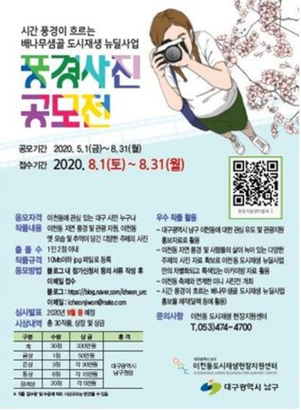 대구광역시 남구청(구청장 조재구)은 오는 8월 말까지 이천동 풍경사진 공모전을 실시한다고 밝혔다.