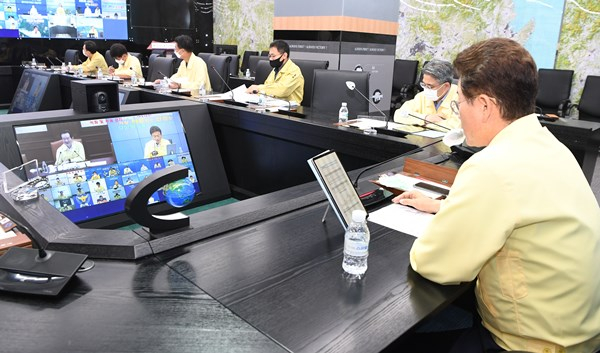 이철우 경북도지사가 7월 31일 각 부처 장관, 시·도지사가 참석한 가운데 국무총리 주재로 열린 코로나19 대응 중앙재난안전대책본부 영상회의에서 통합신공항 이전지 결정에 적극 지원해준 중앙부처에 감사의 인사를 전했다.