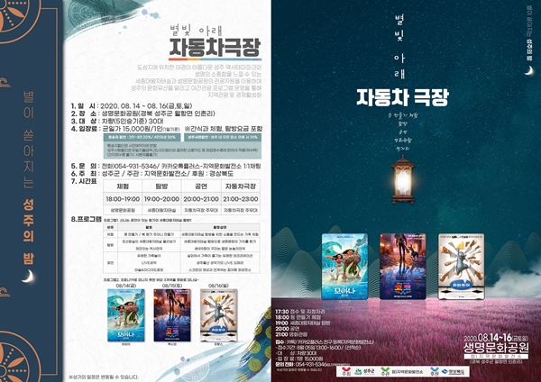 “별빛아래 자동차 극장”은 8월 5일(수) 13시부터 지역문화발전소 카카오톡 플러스친구를 통해 1일 30대, 총90여대를 선착순으로 접수할 예정이며, 궁금한 사항은 성주군청 문화관광과(☎054-930-8373)로 문의하면 된다.