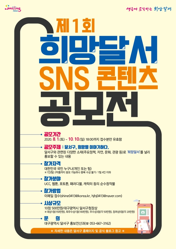 제1회 희망달서 SNS 콘텐츠 공모전은 ‘달서구 희망을 이야기하다'를 주제로 정책, 일자리, 자연, 문화, 관광 등 달서구와 관련한 다양한 콘텐츠를 공모한다.