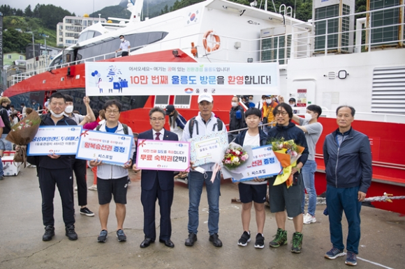 울릉군은 9일 저동항 여객선터미널에서 울릉군수와 관계공무원이 참석한 가운데 울릉도 관광객 10만 명 돌파 기념 행사를 개최하고 10만 번째 관광객에게 특산품 및 꽃다발 등을 증정했다.